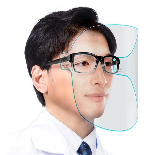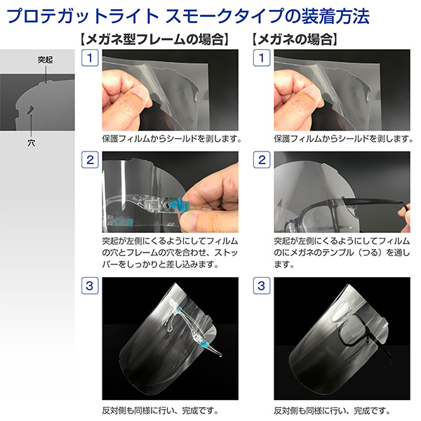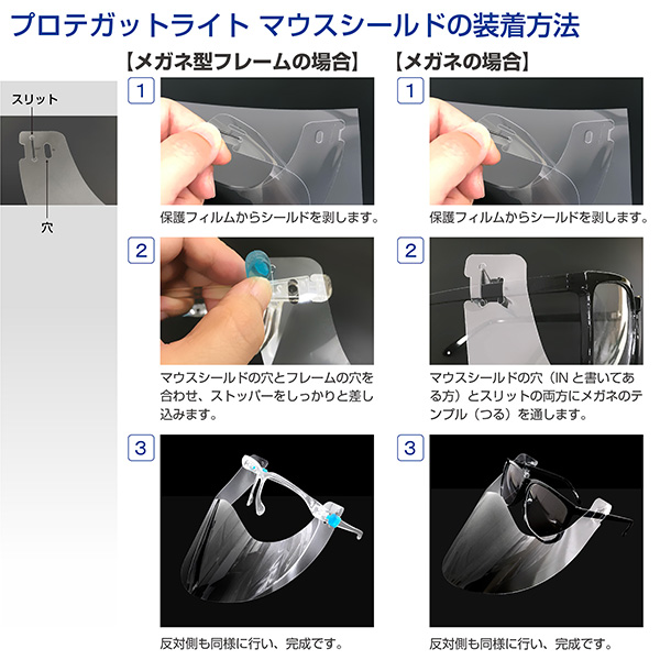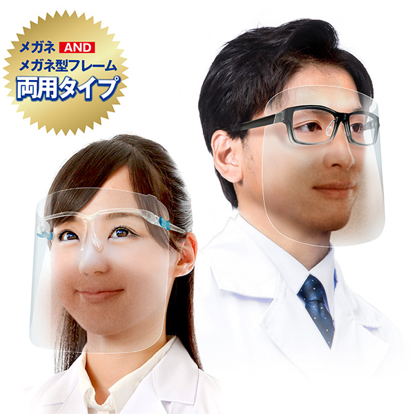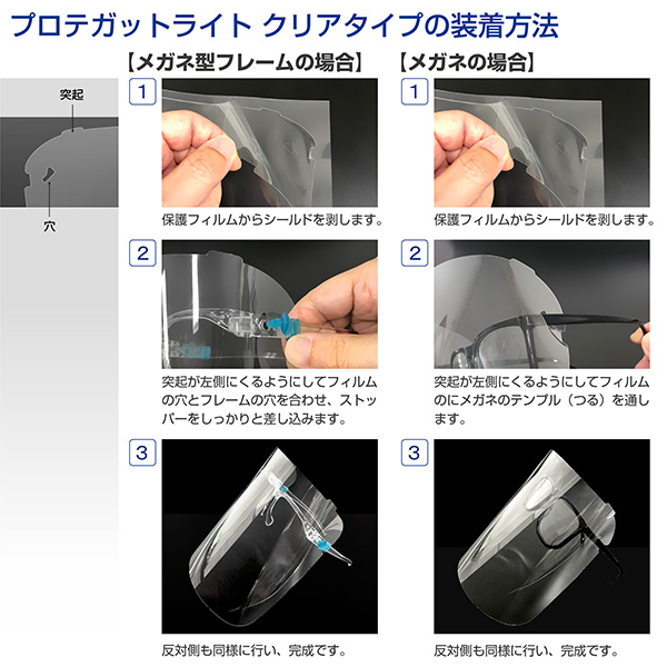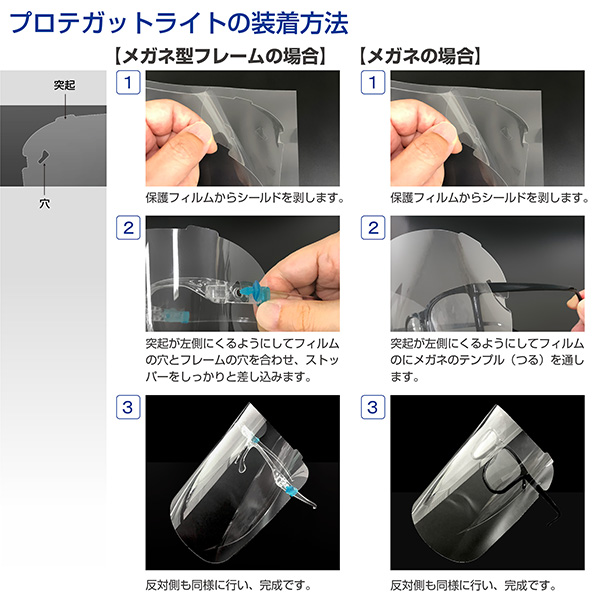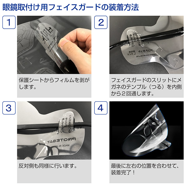 ○お手持ちのメガネに簡単装着可能です。○日本製フェイスシールド:透明PET/0.188mm