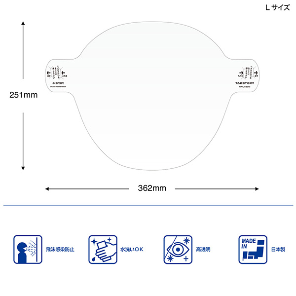 ○口元に外側から飛沫が目立たない特殊な印刷を施しています。○シールド:透明PET/0.188mm