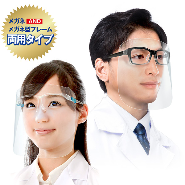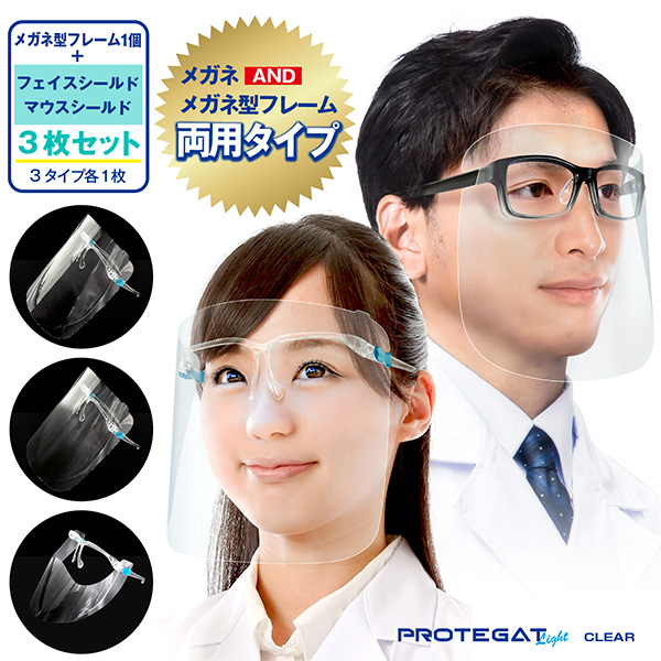 ○フェイスシールド2タイプ各1枚とマウスシールド1枚のシールド3枚とメガネ型フレーム1個のお得なセットです。