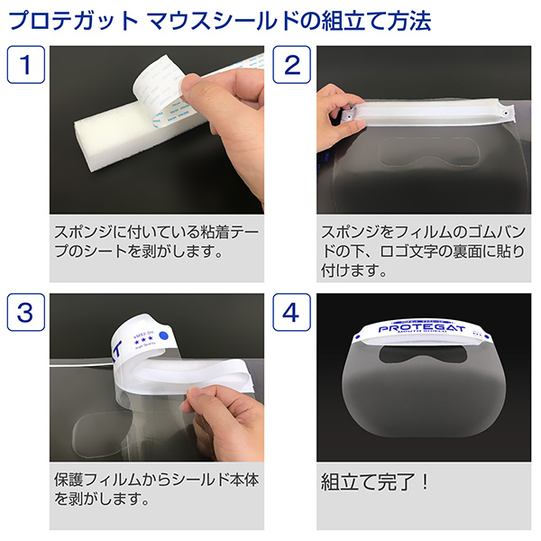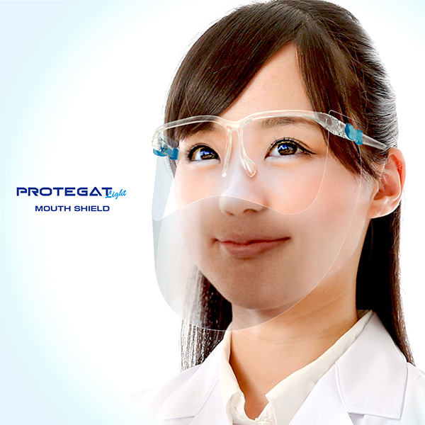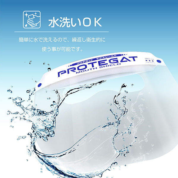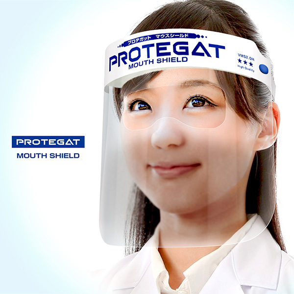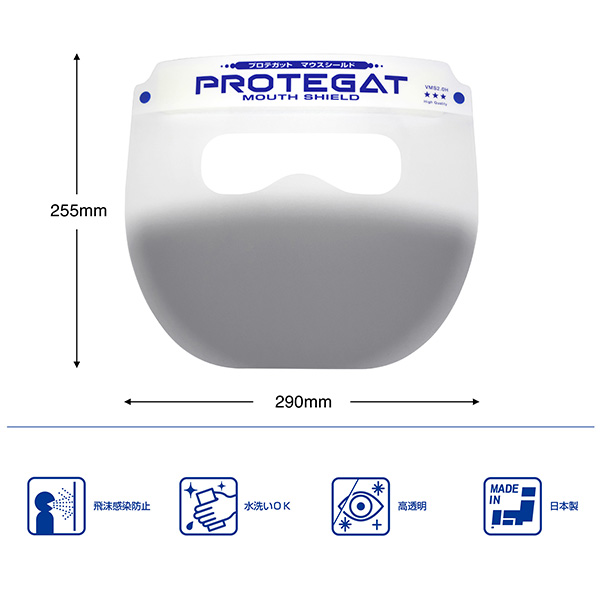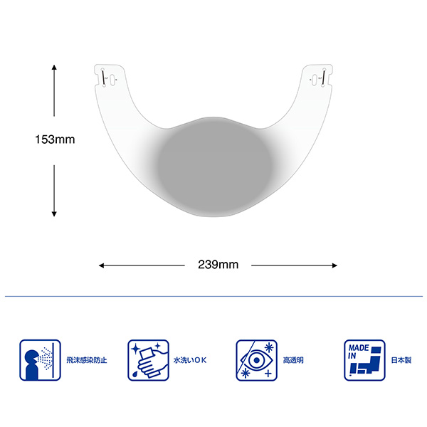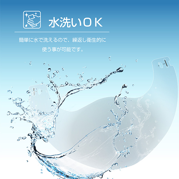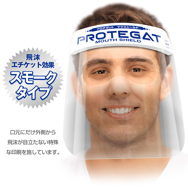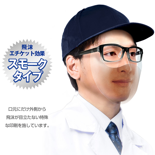 口元に外側から飛沫が目立たない特殊な印刷を施しています。○シールド:透明PET/0.188mm